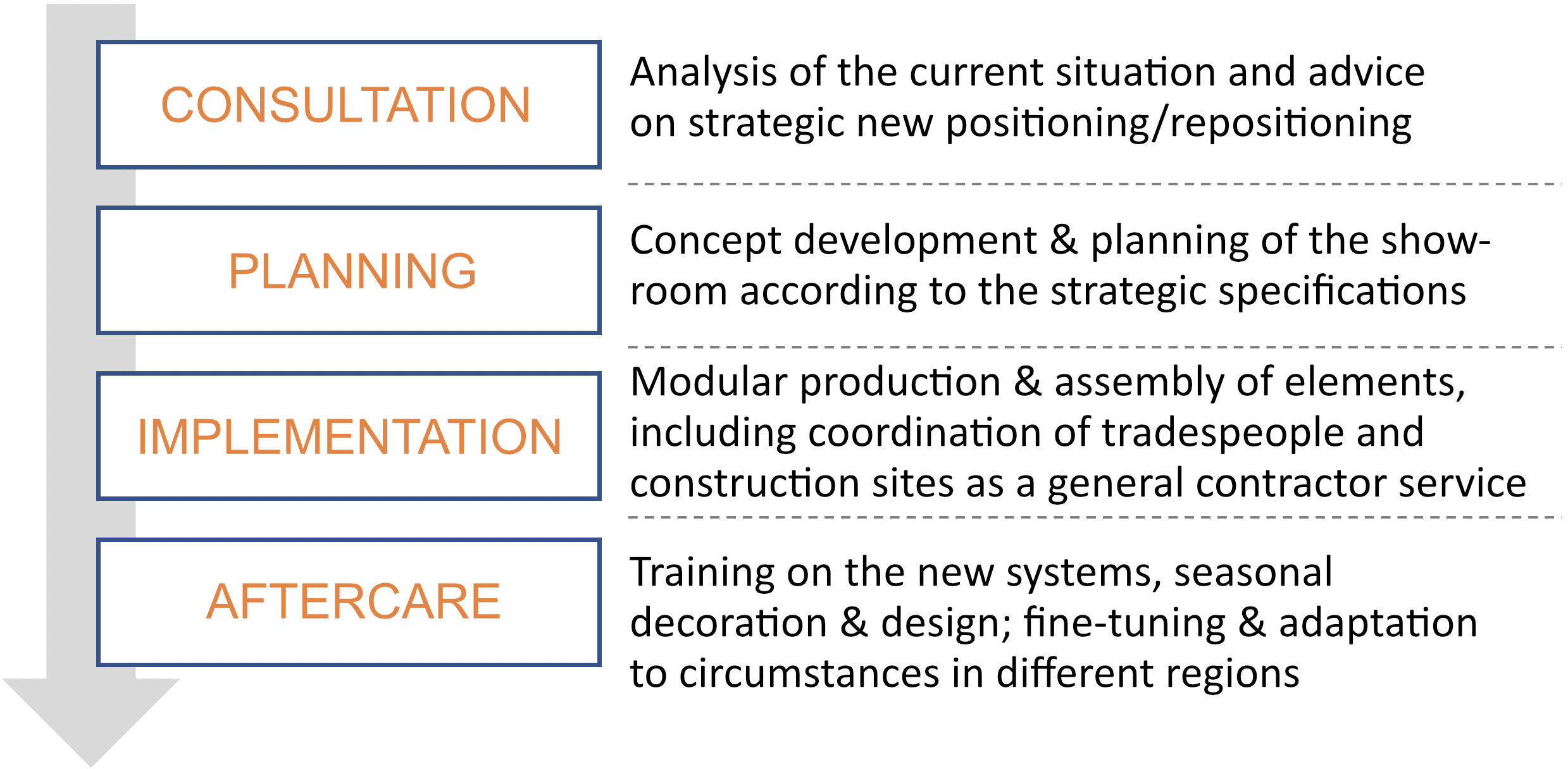 - Our service portfolio covers the entire value chain, from conceptual planning to the construction of custom exhibition elements, through to the installation and turnkey handover of the sales space.