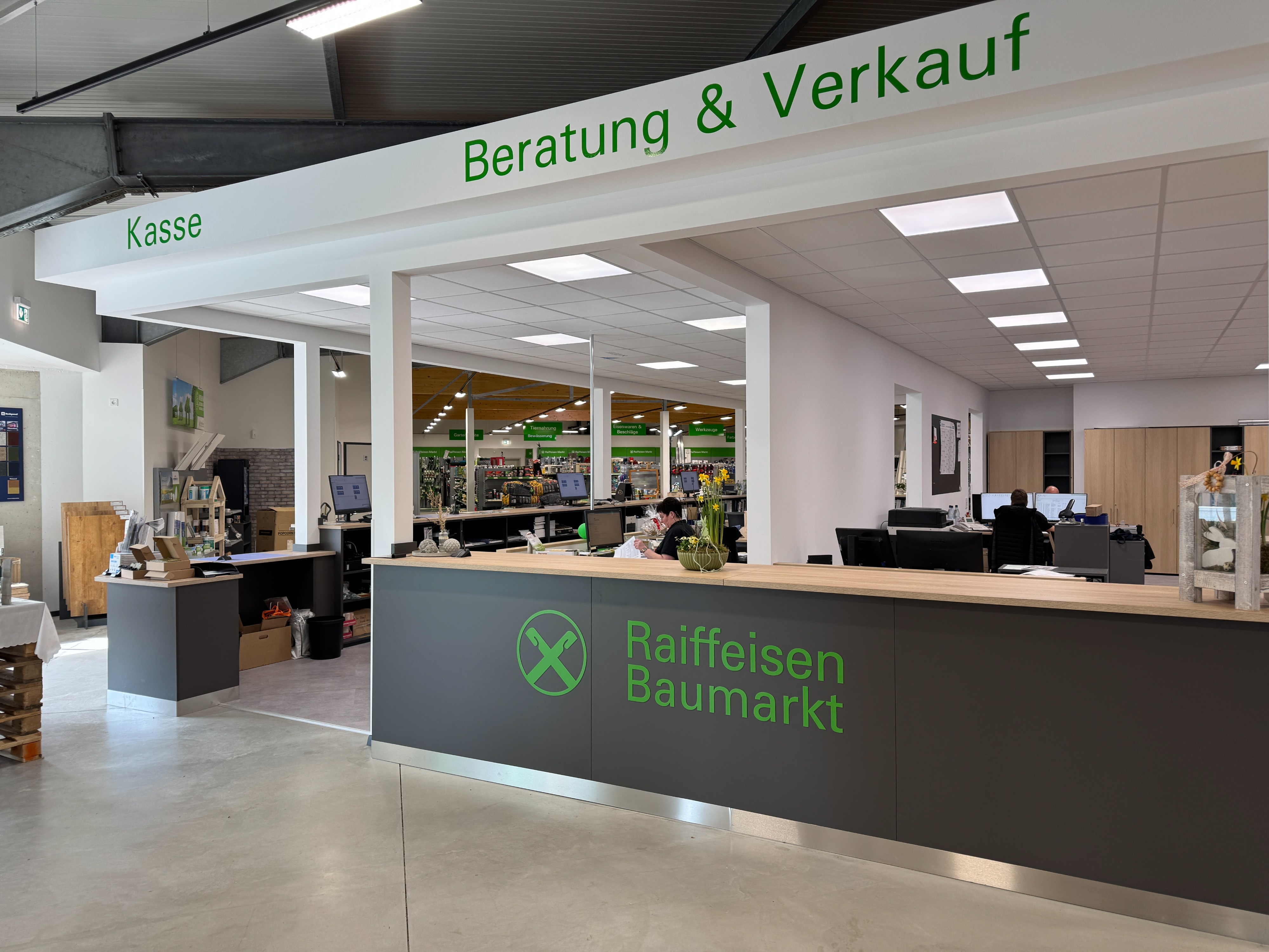 A welcoming sense of space is conveyed by the newly designed, visually striking entrance area of the bright and spacious building, which now spans approximately 1,400 square meters—almost twice the size it was before the renovation. From here, a wide central aisle leads through the store, offering over 50,000 products for DIY enthusiasts, tradespeople, and garden lovers—from beginners to professionals—covering everything needed for the home, property, garden, and outdoor areas. The clearly visible service and consultation point, along with a well-thought-out customer guidance system, ensures that visitors can easily find their way around the store.
