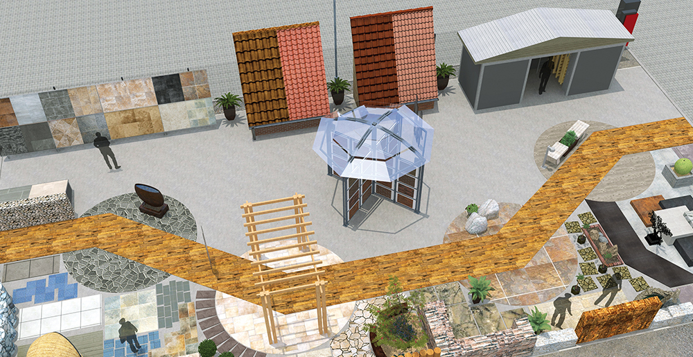 Zur Gestaltung Ihrer gesamten Außenausstellung empfehlen wir einen landschaftlich inspirierend gestalteten Bereich mit verschiedenen Themengärten – dazu dann den Auswahlbereich mit unseren verzinkten, wetterbeständigen Präsentations-Modulen. Realistischer und eindrucksvoller lassen sich Pflastersteine, Gehwegplatten oder Hausfassaden kaum präsentieren als mit einer GaLa-Planung von HAUFF.