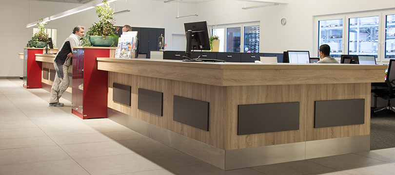Mit einem individuell gestalteten Empfangstresen glänzt Ihr Unternehmen bereits im Eingangsbereich mit einem unverwechselbaren Gesicht. Deshalb sollten Sie sich für eine hochqualitative Lösung entscheiden, die wir mit unserem Know-how jederzeit für Sie realisieren können. Wir entwerfen ganz nach Ihren Vorstellungen ein Empfangsmöbel für Sie, das Funktionalität und ansprechende Optik gekonnt vereint und sich harmonisch in das Ausstellungskonzept integriert.