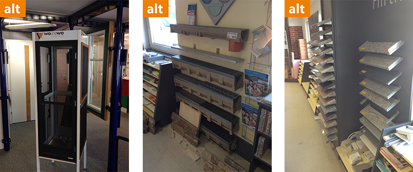 Spezialmöbel zur Präsentation kompletter Fußbodenaufbauten und Blick in die großzügige Türenpräsentation