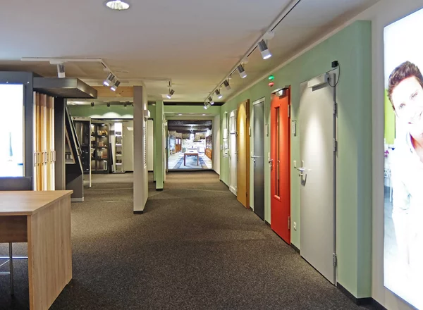 Spezialmöbel zur Präsentation kompletter Fußbodenaufbauten und Blick in die großzügige Türenpräsentation