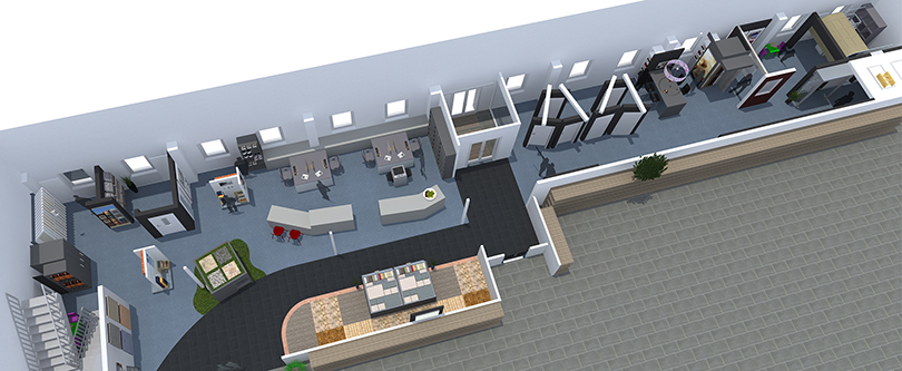 Hauptaugenmerk bei der Planung lag auf der Raumorganisation – der ca. 38 m lange, aber nur 5 m bis max. 9 m breite Raum sollte eine offene, großzügige Raumwirkung haben, die den Kunden auf den ersten Blick einen Gesamteindruck von Produktumfang in diesem Bereich gibt. Keine leichte Aufgabe, wenn man bedenkt, dass die Raumhöhe in den überwiegenden Bereichen bei gerade einmal ca. 2,55 m liegt, was den Schlauchcharakter der Fläche zusätzlich verstärkt. Durch eine geschickte Auswahl und Anordnung der Präsentationsmodule, eine klare Wegeführung, frische Farben und den Einsatz von emotionalen Bildmotiven konnten wir den optischen Eindruck der Ausstellung strecken und ein wohnliches Ambiente im Verkaufsraum schaffen.