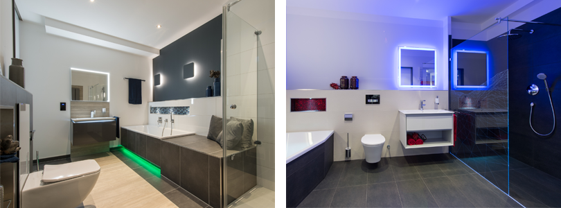 Die letzte Reihe präsentiert neben den Kojen ein paar technische Raffinessen. Es gibt zwei Lichtbäder, in denen sich der Kunde einen Eindruck von den verschiedenen Lichtfarben und Akzentuierungen verschaffen kann. Zur Verdunkelung der Bäder wurden raumhohe Glasschiebetüren mit blickdichter Folieneinlage eingesetzt. Zentral liegt ein Besprechungsraum und direkt daneben befindet sich der Technikbereich für Klima, Lüftung und Heizung.