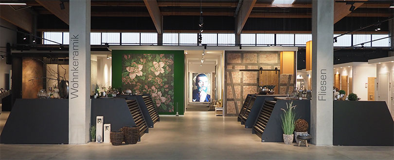 Auf der Ideenfläche zum Thema Wohnkeramik und Fliesen bieten schlichte und elegante Bodenschränke viel Raum für Muster. Hier wird Keramik für alle Lebensbereiche gezeigt, zum Erleben durch Sehen und Anfassen.