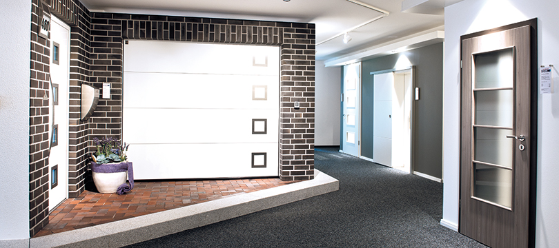 Der Livebetrieb ist bei Garagentoren besonders wichtig, um die Sicherheitsmerkmale und den Bedienkomfort im Verkauf beraten zu können. Darüber hinaus wird an der gegenüberliegenden Wand eine Auswahl an Gestaltungselementen und -alternativen präsentiert, wie Farbtöne, Oberflächenausführungen oder kratzfeste Verglasungsvarianten. Garagentore zu präsentieren, ist ein attraktiver USP für die Baustoffausstellung. Natürlich beansprucht die Präsentationen eines Garagentors Platz, jedoch bietet die intelligente Umsetzung auch einiges an Mehrwert. Beispielsweise kann die Einbindung der Garagentoranwendung in eine komplette Fassade aus Fenstern, Haustür, Verblendung und Dachziegeln als gelungene Architektur zum Highlight in der Ausstellung werden. Welcher Händler seinen Kunden dann auch noch den Einbau des Garagentores durch eigene Monteure anbieten kann, setzt dem Ganzen das i-Tüpfelchen über den Service auf.
