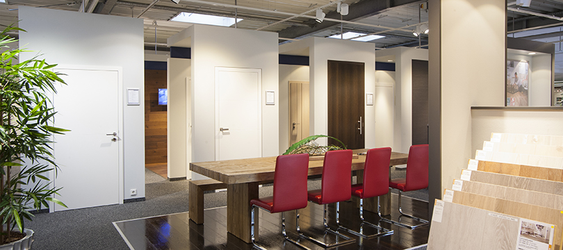 Eine Vielzahl von Innentüren in allen Größen wird platzsparend in einem Wandmagazin gezeigt, ohne dass der Ausstellungsraum überladen wirkt. Die exklusiven Türen dagegen werden in Wandscheiben präsentiert. Damit der Kunde sich auf das Wesentliche konzentrieren und direkt die unterschiedlichen Designs, Formate und Höhen vergleichen kann, sind diese Wandscheiben minimalistisch gestaltet mit einem farbig abgesetzten Element, das die Firmenfarbe wieder aufnimmt.