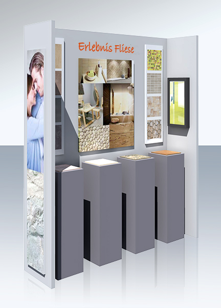 Dieses Konzept besteht aus drei Grundmodulen in verschiedenen Breiten, welche je nach räumlicher Gegebenheit individuell aneinander gesetzt werden können. Die Module bestehen aus einer Wand, der passenden Tafel und einer Präsentations-Säule in zwei Größen. Auf der Säule findet Ihr Präsentationsmodell Platz, auf der darüber hängenden Tafel wird dem Kunden das Thema grafisch erläutert.