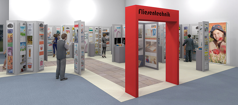 Mit hochwertigen Zweifach- oder Dreifachverbindern werden die Tafeln untereinander verbunden und lassen so viel Spielraum für verschiedene Grundrissvarianten. Wie z. B. die Nutzung der Module als Erlebnispfad Fliese, einer Konfiguration zur kompakten Information rund um die Fliese.