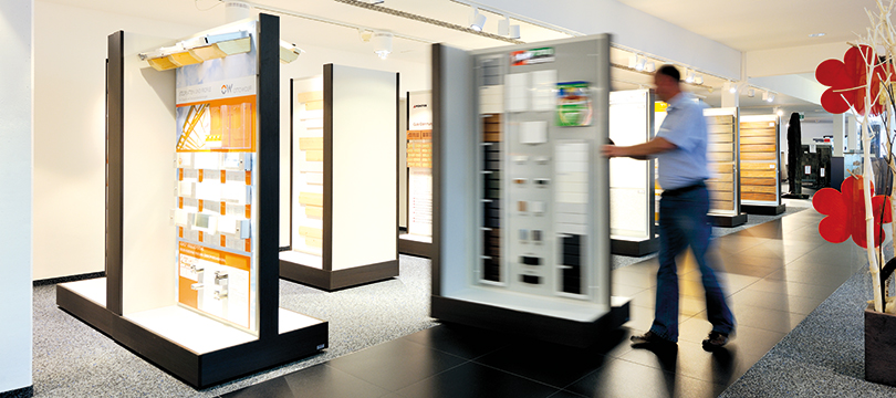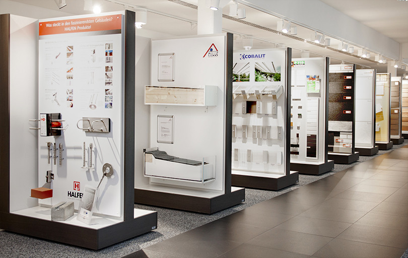Mobile Ausstellungselemente bieten so einige Vorteile: der größte ist ihre Flexibilität. Die rollbaren Module lassen sich ganz unterschiedlich nutzen, besonders zur Präsentation von diversen Haustechnikanwendungen oder Sonderthemen, wie Energiesparen und Sanieren. Der baugleiche Aufbau der Module sorgt für optische Ruhe und klare Strukturen bei sehr unterschiedlichen Produkten, Systemen und Mustern. Alles steht übersichtlich in Reih und Glied, statt in einem Konglomerat aus diversen Herstellerdisplays. Erklärungsbedürftige Produkte lassen sich so präsentieren, dass sie sich selbst erklären. Die Ausstellung übernimmt damit einen Teil der Verkaufsberatung automatisch mit. Die Kunden können sich gezielt zu bestimmten Themen informieren und sich einen guten Überblick über die verschiedenen Angebote verschaffen. Gerade im Bereich der Trendthemen wie Dämmsysteme ist die Entwicklungsrate relativ hoch. Der schnelle und einfache Wechsel der Produktpräsentationen an den mobilen Haustechnikmodulen von HAUFF ist daher besonders wirtschaftlich. Die Konfiguration der Module kann je nach Themenschwerpunkten neu zusammen gestellt bzw. gerollt werden. Außerdem kann der Platz in der Ausstellung flexibel genutzt oder auch geschaffen werden. Wird mehr Freiraum, z. B. für eine Kundenveranstaltung benötigt, werden die mobilen Ausstellungselemente einfach verschoben. Mit diesen Modulen kommt Bewegung in die Baustoffausstellung.
