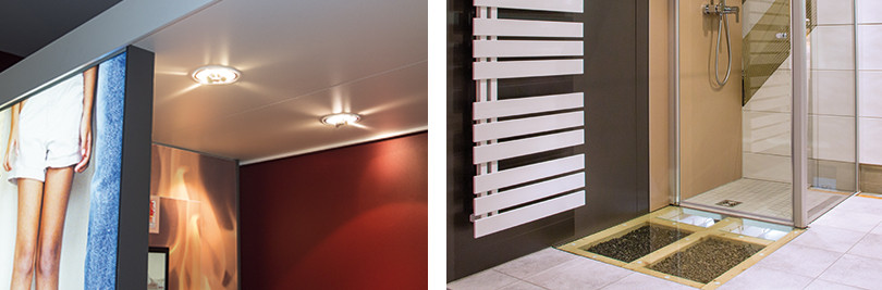 Der Podestaufbau des Bodens ermöglicht es, transparente Sichtfelder einzusetzen und dem Kunden anschaulich Einblicke in die sonst verborgene Technik zu geben. Perfekt ausgeleuchtet von zwei Multispot-Einbaustrahlern.