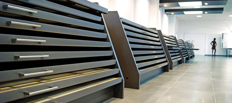 Die neuen XXL-Möbel sind eine Weiterentwicklung des Möbelprogramms EuroLine Plus, das allein mit seinen über 4.000 Ausstattungsvarianten einzigartig ist. Die neue Generation greift in der Farbgebung den aktuellen Zeitgeist auf: Bronze, Kupfer und trendige Holzdekore, wie ein spezielles Eichendekor, prägen ein exklusives Präsentationsdesign. Je nach Beleuchtung changieren die Farbtöne sehr schön. Die Wirkung ist apart und hochwertig. Auch funktionell sind die neuen Schwerlastmöbel das Nonplusultra. Die starke Leistung der robusten und eleganten Metallvollauszüge sowie die Kugellagertechnik haben sich bereits in der Vergangenheit durch langlebige Funktionalität bewährt. Sämtliche Beschlagtechniken sind Eigenentwicklungen von Hauff. Der Bodenschrank bietet auf 10 Musterflächen Platz für bis zu 182 x 121 cm große Tafeln. Belastungen von 100 kg pro Tafel bewältigt der Bodenschrank mit spielerischer Leichtigkeit.