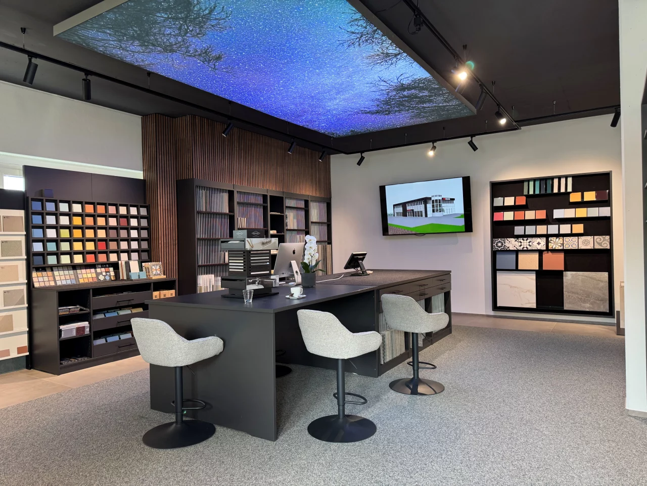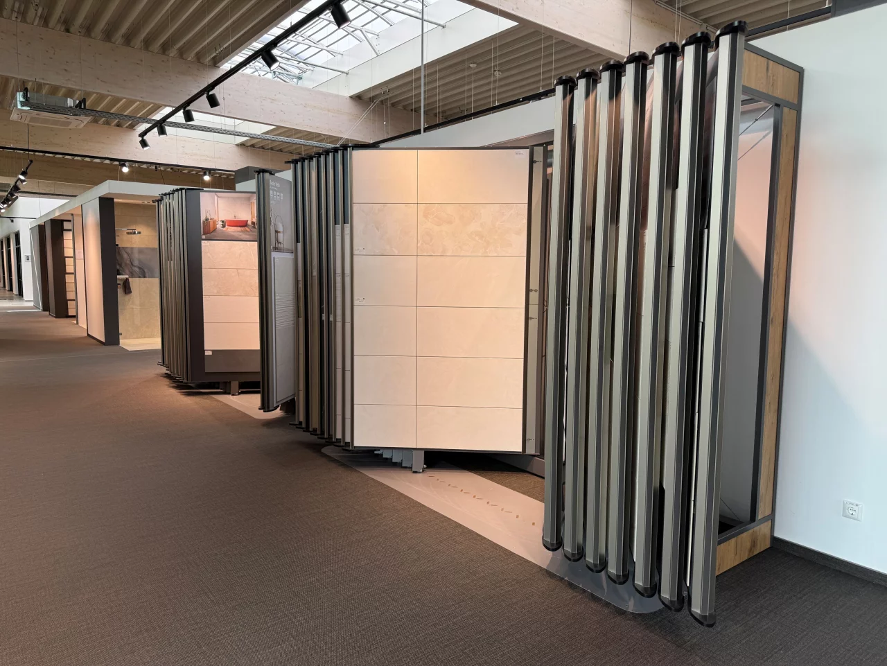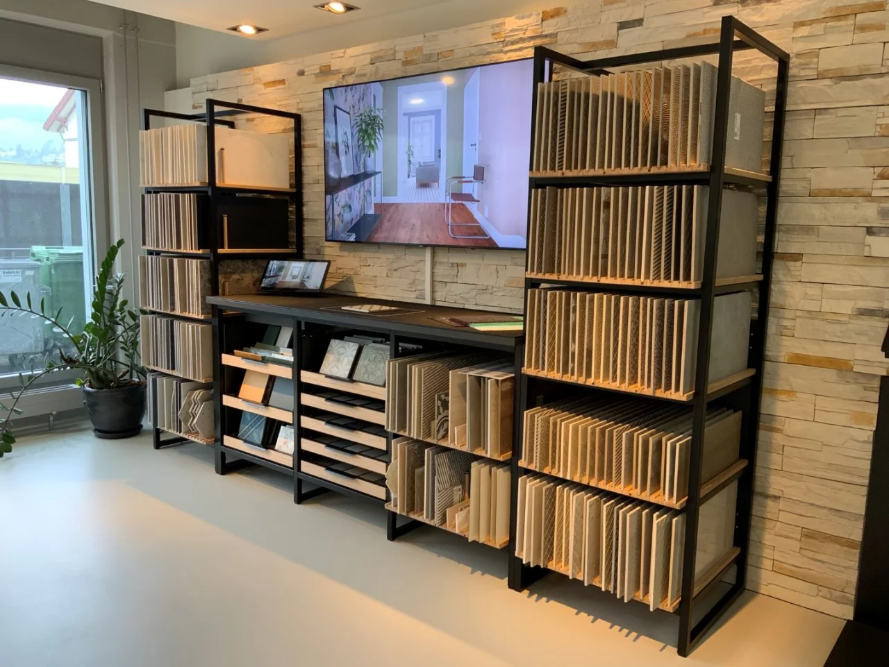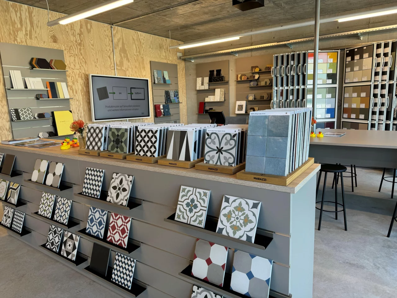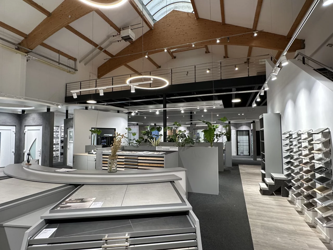 Hier sehen Sie exklusive Verkaufsräume, die wir gestaltet haben - hochwertige Showrooms für Fliesen, Sanitär, Parkett, Türen sowie edle Außenbaustoffe wie Granit-Terrassenplatten und großformatige Terrassenfliesen.