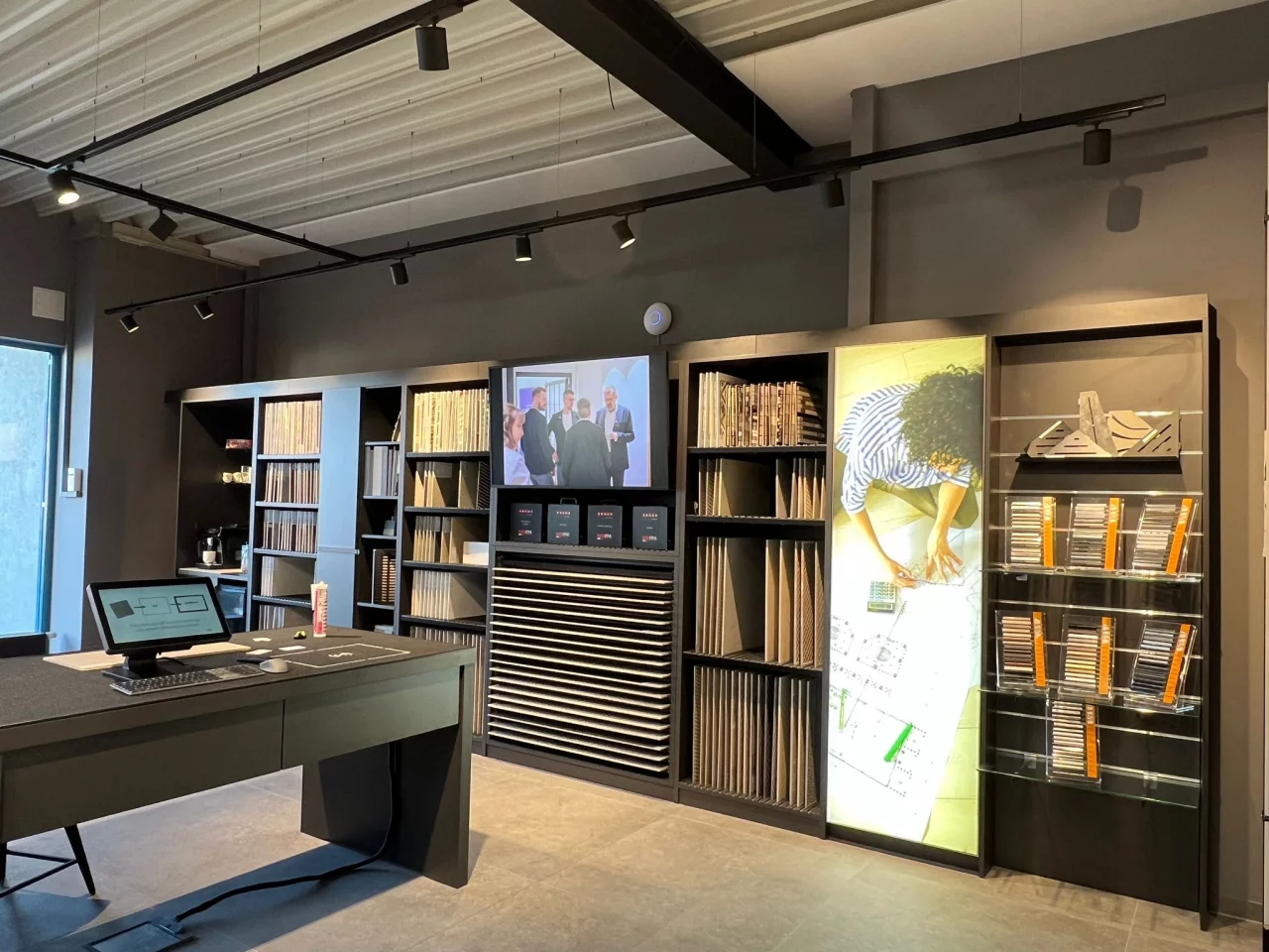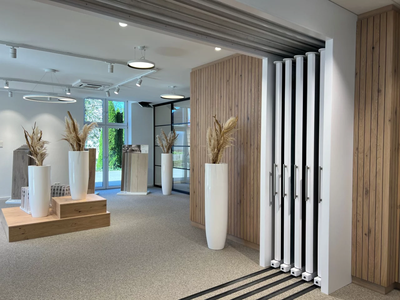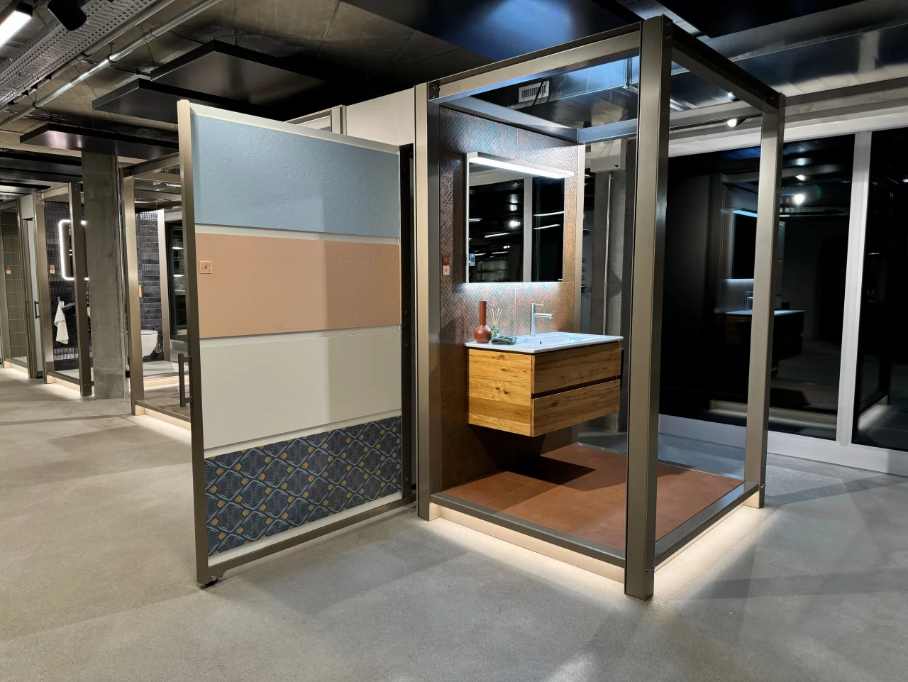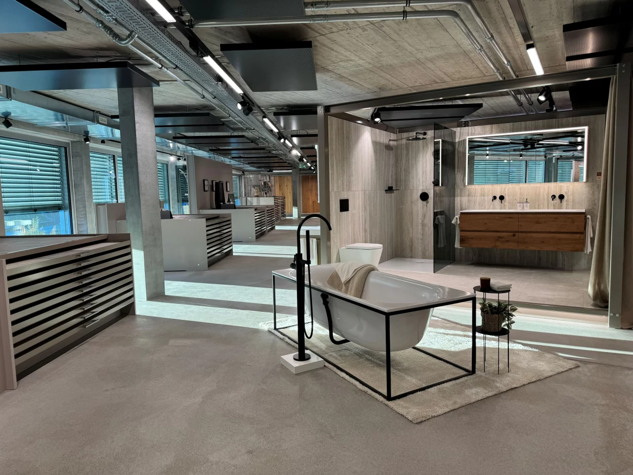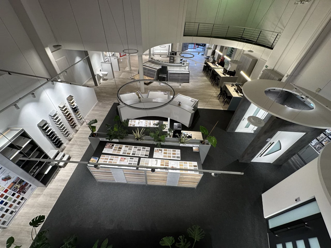 Hier sehen Sie exklusive Verkaufsräume, die wir gestaltet haben - hochwertige Showrooms für Fliesen, Sanitär, Parkett, Türen sowie edle Außenbaustoffe wie Granit-Terrassenplatten und großformatige Terrassenfliesen.