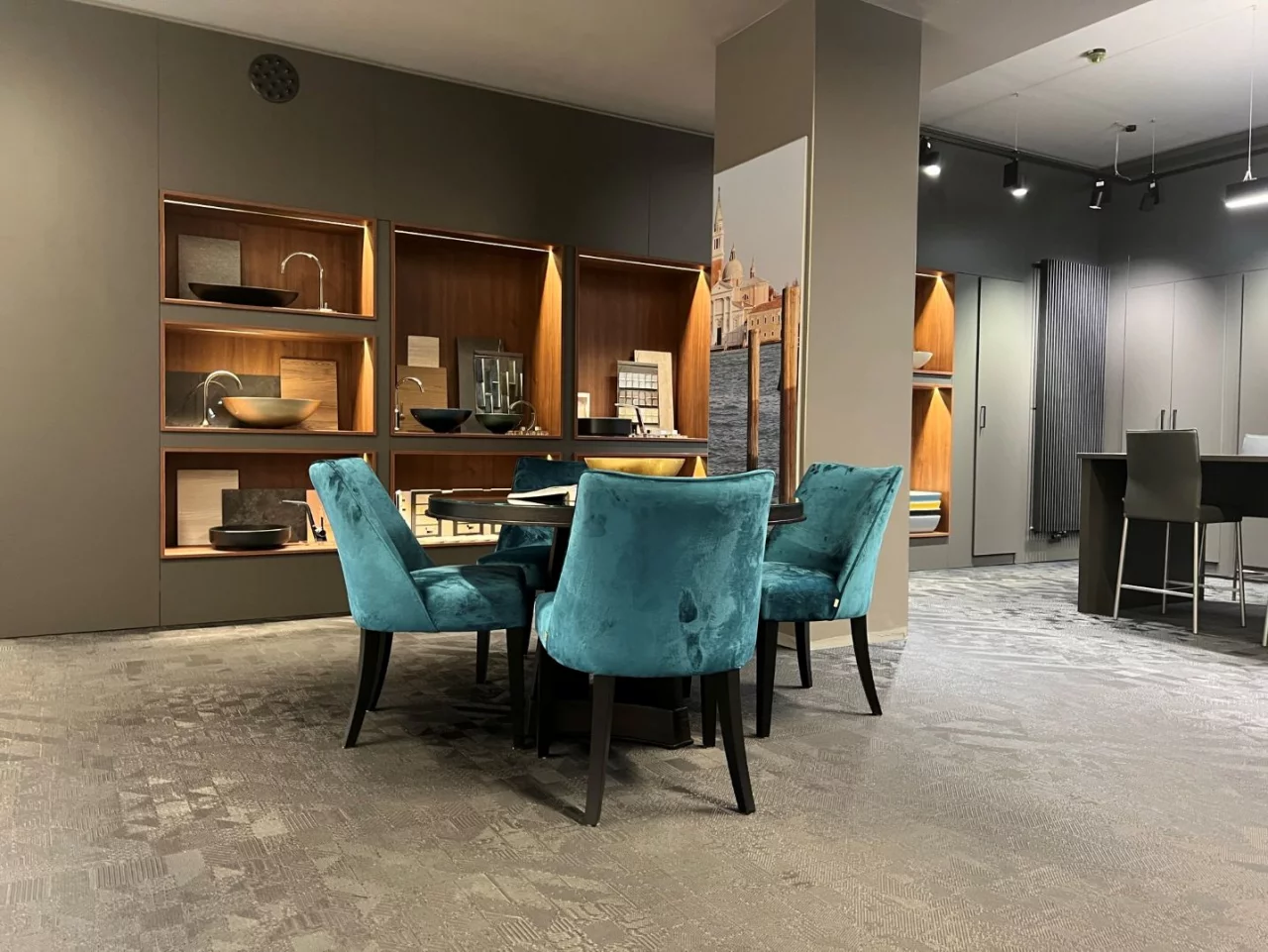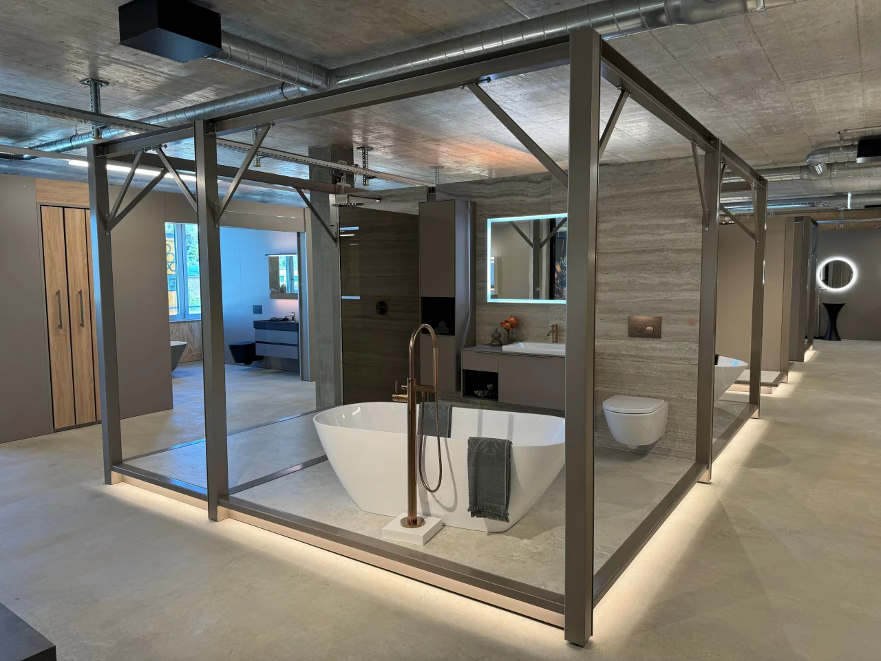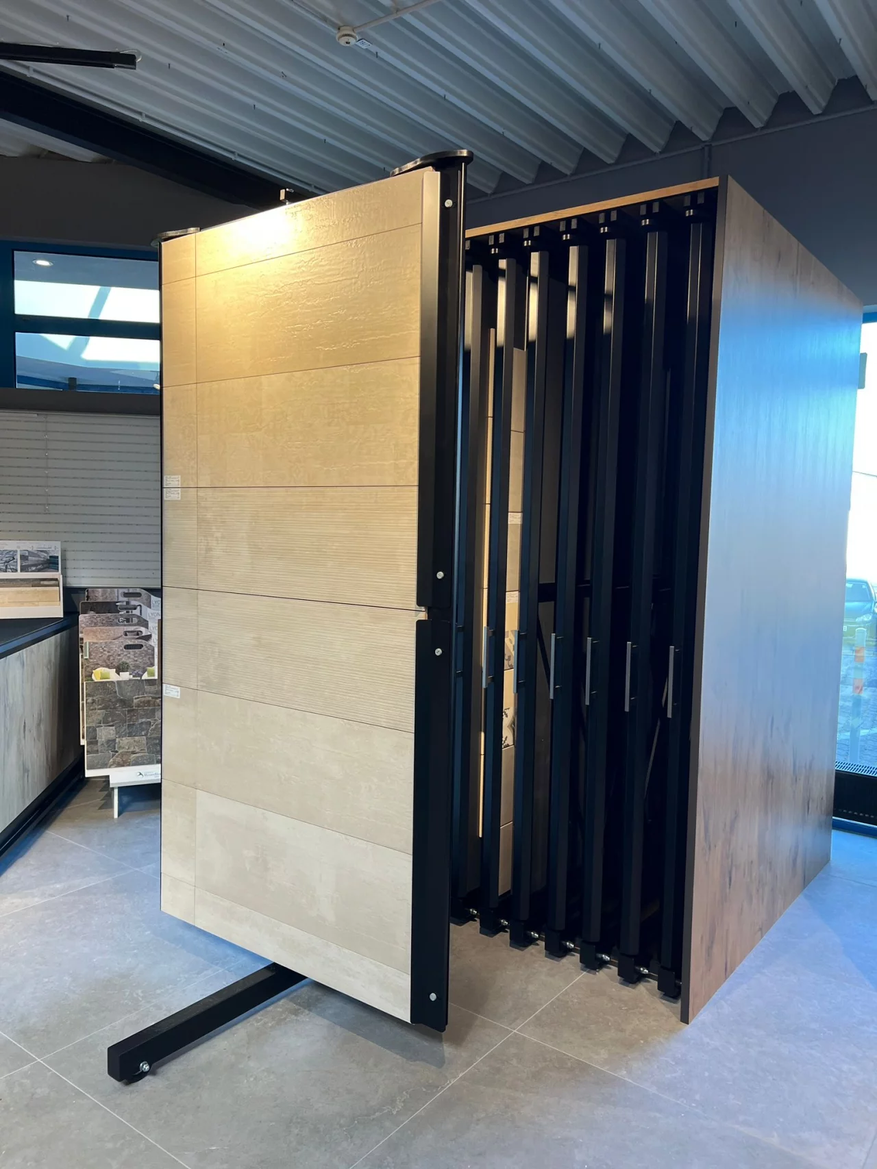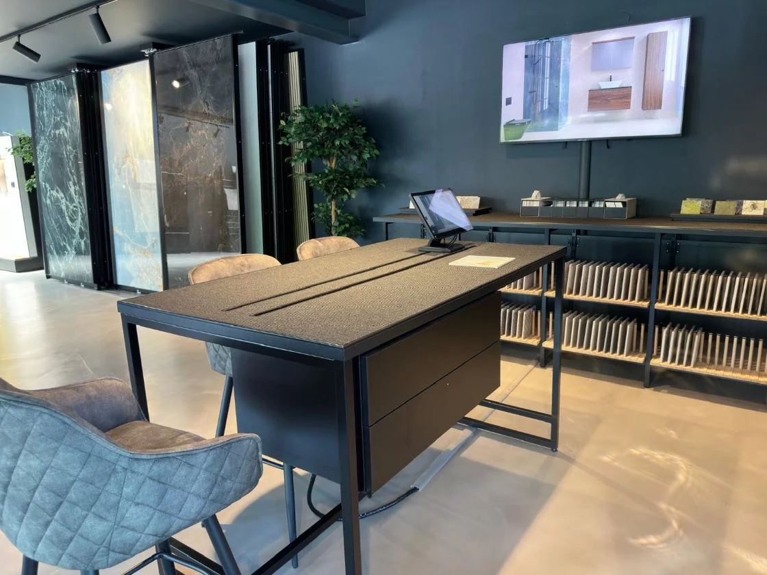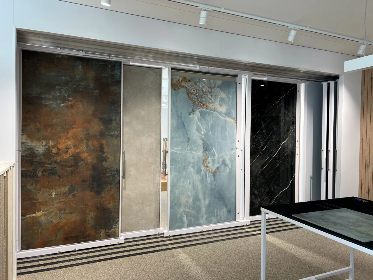 Hier sehen Sie exklusive Verkaufsräume, die wir gestaltet haben - hochwertige Showrooms für Fliesen, Sanitär, Parkett, Türen sowie edle Außenbaustoffe wie Granit-Terrassenplatten und großformatige Terrassenfliesen.