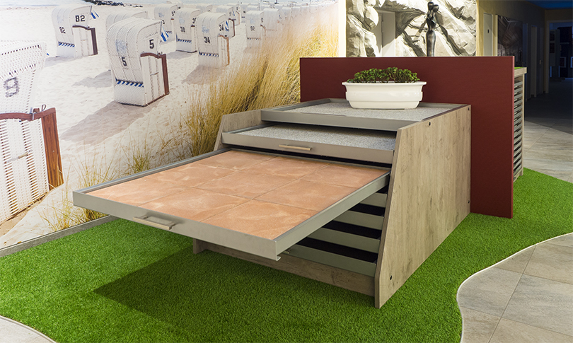 Daher sollten Sie Ihren Kunden die Terrassenbeläge auch entsprechend rechtzeitig präsentieren, zum Beispiel mit unserem Gala Magazincube. Diese kompakte Insellösung setzt sich aus zwei Magazinschränken in unterschiedlichen Größen und einem offenen Prospektregal zusammen.