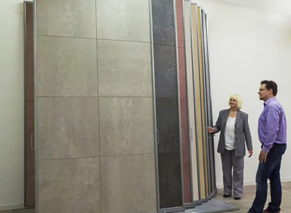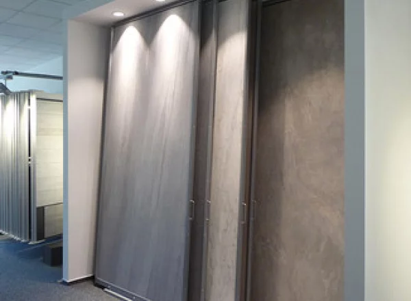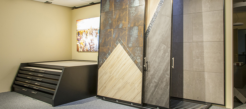 Großformatige Fliesen sind starke Anziehungspunkte in Ihrem Verkaufsraum, die ihre volle Wirkung erst in der Fläche entfalten. Das stellt besonders hohe Ansprüche an die Konstruktion und technische Ausrüstung der Präsentationsmöbel. Wir haben für diese Großformate u.a. eine Wand-Schiebetafel-anlage entwickelt, die Fliesen im Format 150 x 300 cm aufnehmen kann und trotzdem leicht zu bedienen ist.