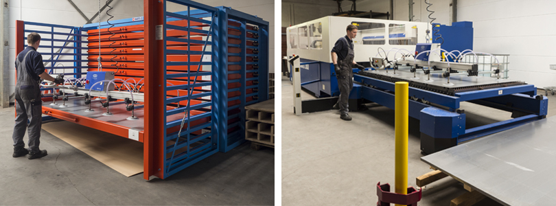 Bestückt wird die Laserschneidanlage durch ein direkt angeschlossenes Blechtafellager. Hierbei können wir die Tafeln entweder flexibel aus einem Schubsystem als Einzeltafeln oder als komplettes Paket aus dem Kragarmregal für die Serienproduktion zuführen. So können wir flexibel auf die unterschiedlichen Losgrößen reagieren. Die Lagerkapazität in den Systemregalen umfasst insgesamt 40 Tonnen.