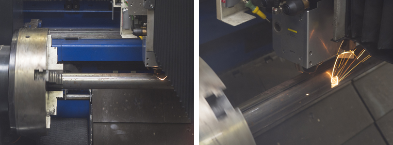 Als zusätzliches Tool zur Blechverarbeitung hat die Anlage ein Aggregat zum Laserschneiden von Rohrquerschnitten. Verarbeitet werden können Rund-, Quadrat- oder Rechteckrohre von 500 mm bis 6000 mm Länge und 15 mm bis 400 mm Durchmesser.