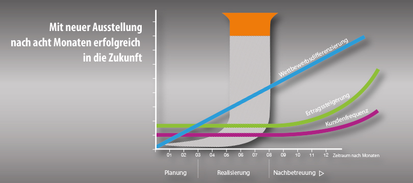 Das Marketingpotenzial einer modernen Verkaufsausstellung ist nicht zu toppen. Eine neue Ausstellung, die Profikunden und Endverbraucher gleichermaßen begeistert, zeigt schnell Wirkung: Im Ertrag, im Imagegewinn und in der Kundenfrequenz. Letztere erhöht sich innerhalb des ersten Jahres nachweislich um etwa 30 %. So steigt nicht nur automatisch der Umsatz, sondern auch der Gewinn. Denn wer höherwertig präsentiert, kann auch höherwertig verkaufen bzw. mit anderen Margen kalkulieren. Ein strategisch durchdachter Verkaufsraum bietet optimale Voraussetzungen dafür, sich vom Wettbewerb zu differenzieren. So lassen sich Sortiments- und Kompetenzschwerpunkte als einzigartige Lifestylewelten realisieren. Zusammen mit der Verkaufsberatung und dem Service entwickelt sich das schnell zum Alleinstellungsmerkmal im Markt. Daraus resultieren eine positive Imagebildung als Trendgeber, die Ansprache von neuen Zielgruppen und eine gestiegene Wettbewerbsstärke. Mit einer neuen Ausstellung stehen Sie auch in Zukunft auf der Gewinnerseite.