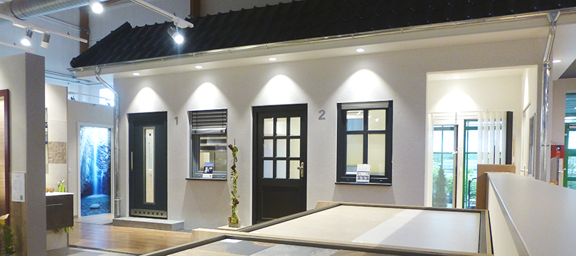 Blickfang dieser Ausstellung bildet das prägnante Musterhaus, in dem Innen- und Außentüren, Fenster, Rollläden, Böden und Decken als Einheit gezeigt werden. Daran schließen sich übersichtlich alle Bereiche rund ums Bauen, Sanieren und Wohnen an. Zentrale Anlaufstelle ist der Tresenbereich, lichtdurchlässige Lamellenwände bilden eine harmonische Abgrenzung zu den dahinter liegenden Arbeitsplätzen.