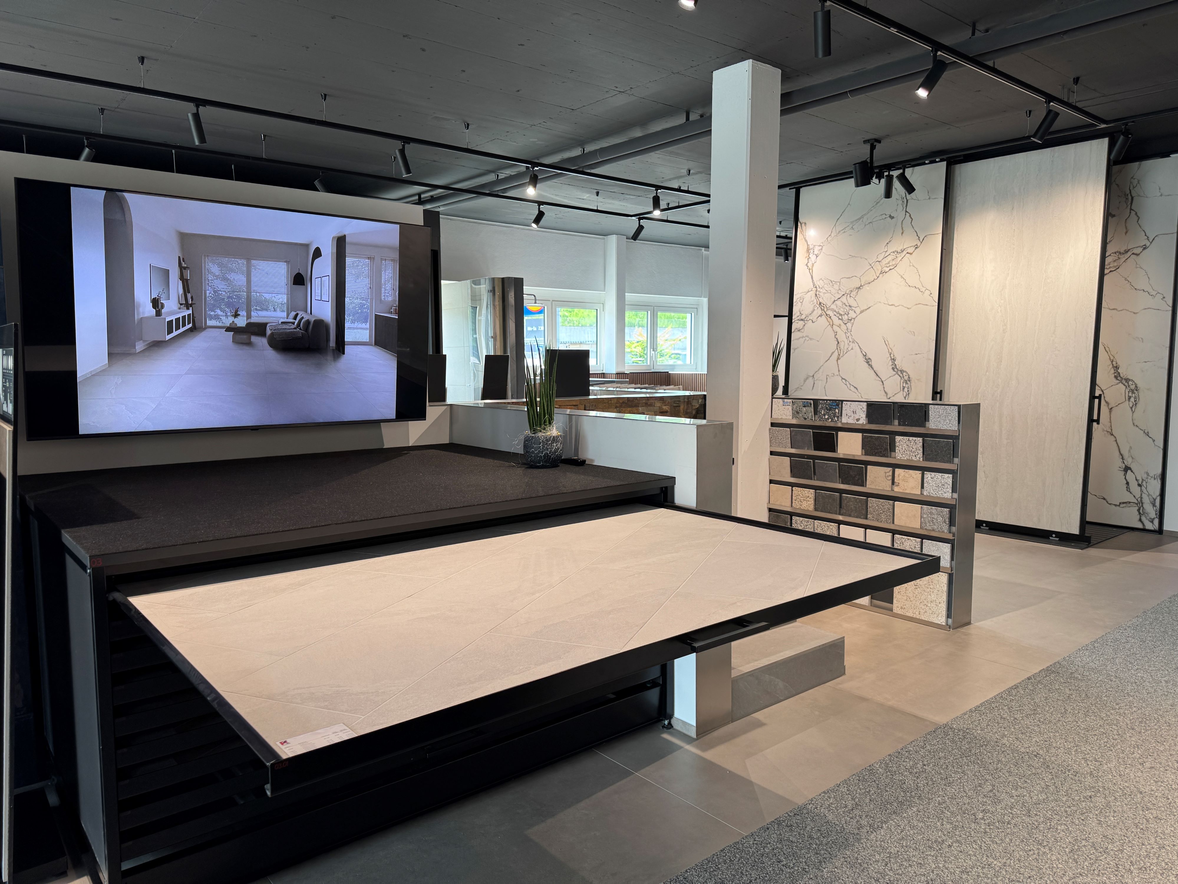 Unsere Ausstellungsmöbel eröffneten Familie Shala zudem neue Möglichkeiten, großformatige Einzelfliesen sowie exklusive Handmuster aus Naturstein ansprechend und übersichtlich zu präsentieren. Der hier gezeigte Bodenschrank mit digitaler MACH-Komponente bringt die Präsentation auf ein neues Level: Großformate lassen sich darin in realistischen Raumbildern visualisieren – direkt am Point of Sale.