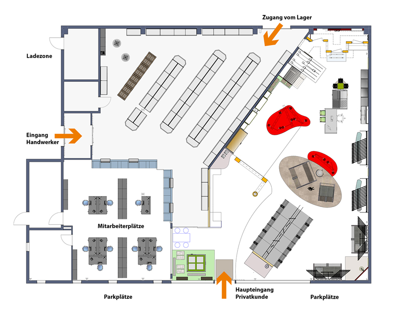 Hinsichtlich der Positionerung und Ausprägung dieser unterschiedlichen Verkaufsbereiche werden wir häufig vor komplexe Aufgaben gestellt. Im Fall Raab Karcher Oberursel ist es die Lage der Eingänge und Zuwegungen.