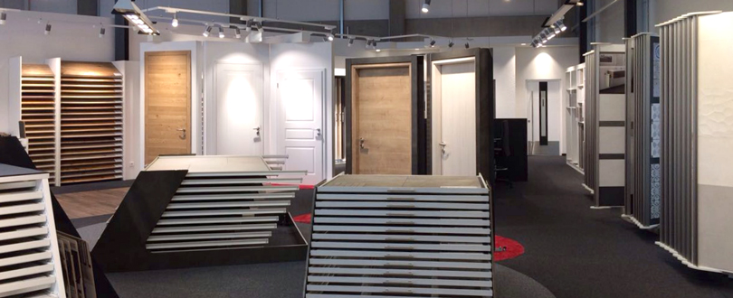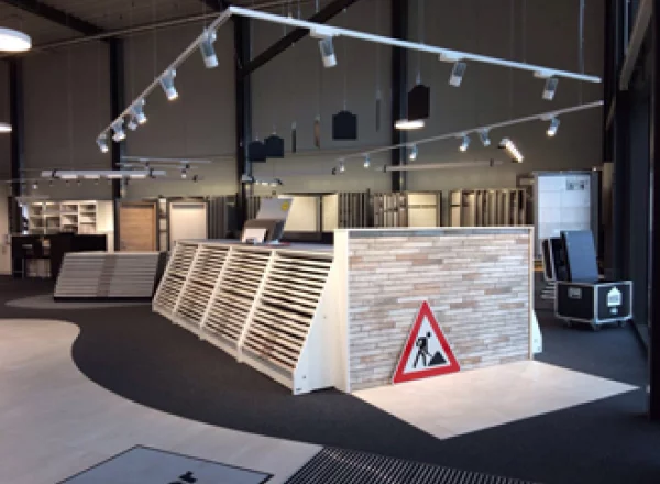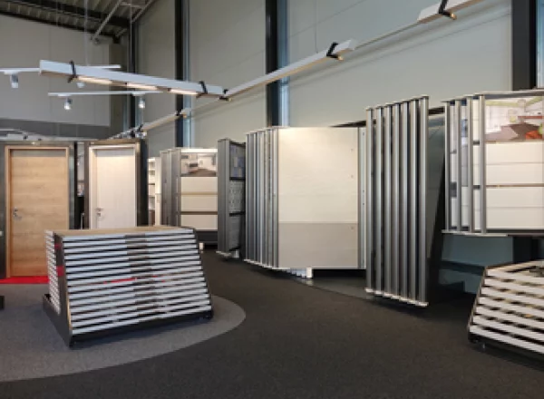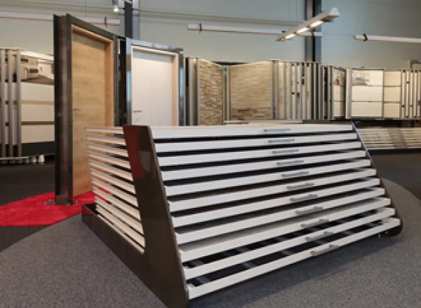 Metallkonstruktionen, auf das Wesentliche reduziert, bilden den Kern der Fliesenpräsentation. Die Farbgebung orientiert sich ebenfalls am Auftritt der Räume und nimmt gestalterisch die Raab Karcher Unternehmensfarben – Rot und Schwarz - gekonnt in die Präsentation auf.