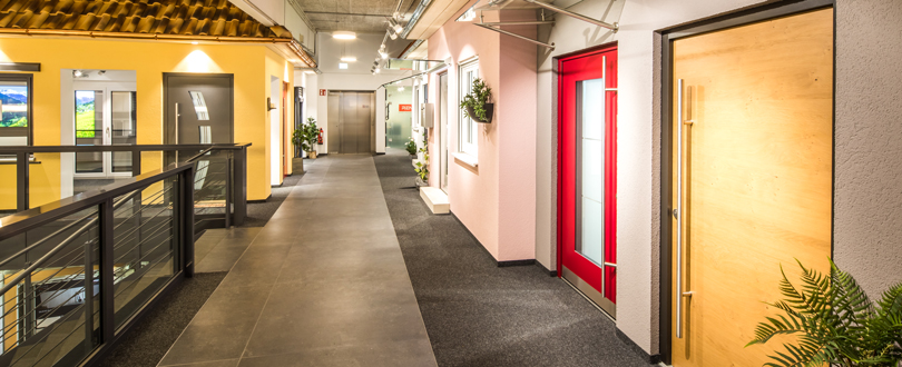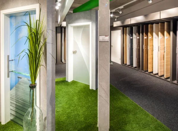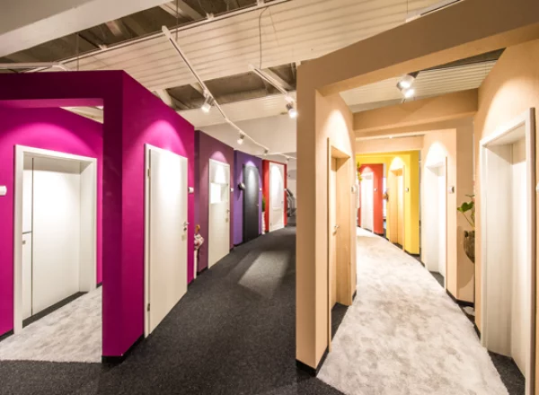 Zahlreiche Innentüren in Funktion und in verschiedenen Höhen werden durch einen Hochflorteppich und farbige Wandscheiben wohnlich und wirkungsvoll in Szene gesetzt. Weitere Glas- und Innentüren werden platzsparend und doch verkaufsattraktiv in Magazinen mit Drehtechnik präsentiert. Auch die Dachflächenfenster sind in Schiebemodulen funktionsfähig eingebaut.