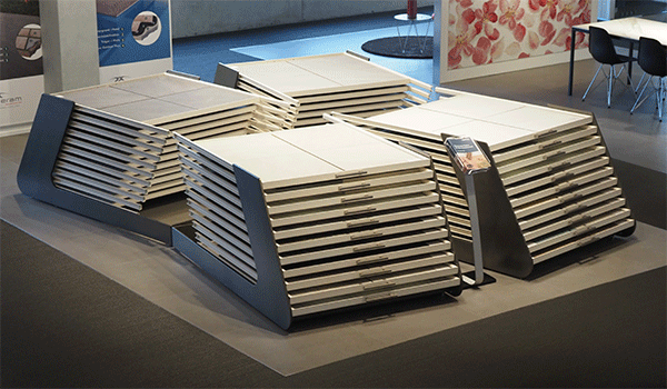 In den zeitlosen Cupa-Präsentationsmöbeln finden insgesamt mehr als 700 Produkte aus den Bereichen Wand- und Bodenbeläge sowie 240 Großformat-Platten bequem Platz. Die freitragenden Auszüge geben den schweren Fliesentafeln eine nahezu federleichte Optik. Und genauso leicht lassen sich die Möbel auch bedienen.