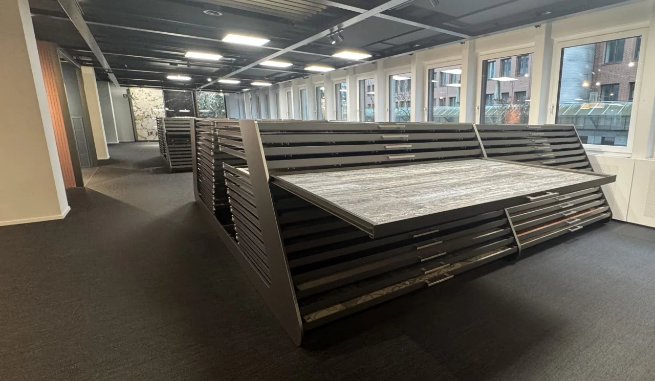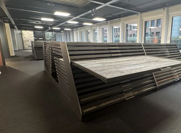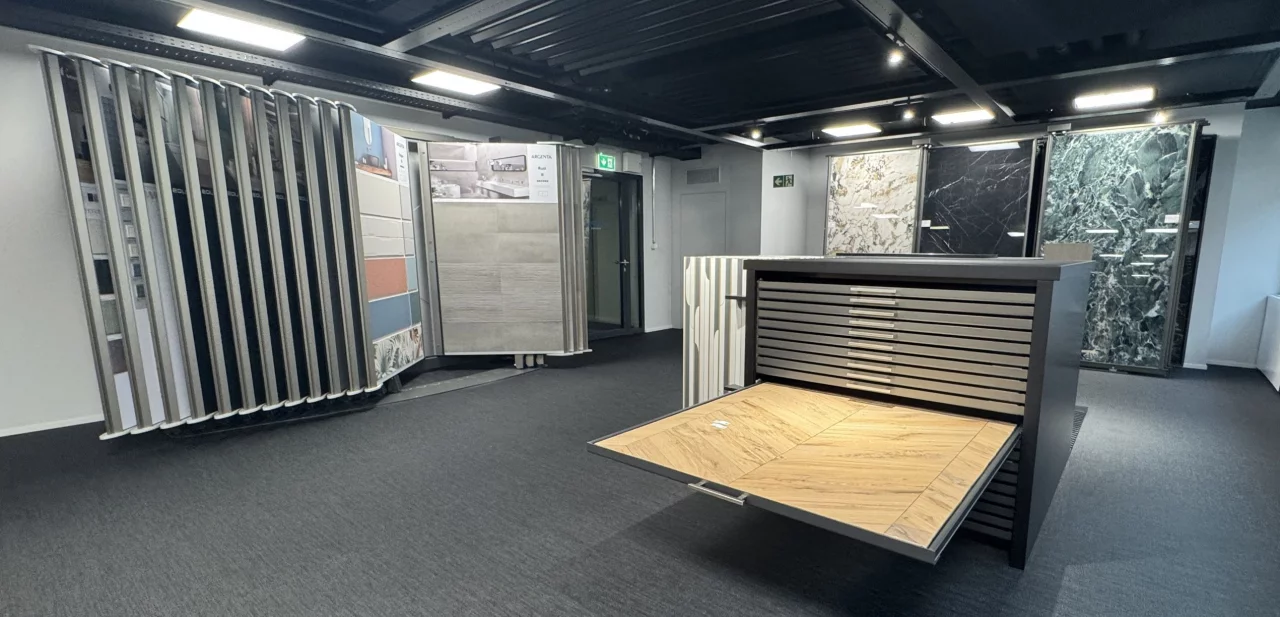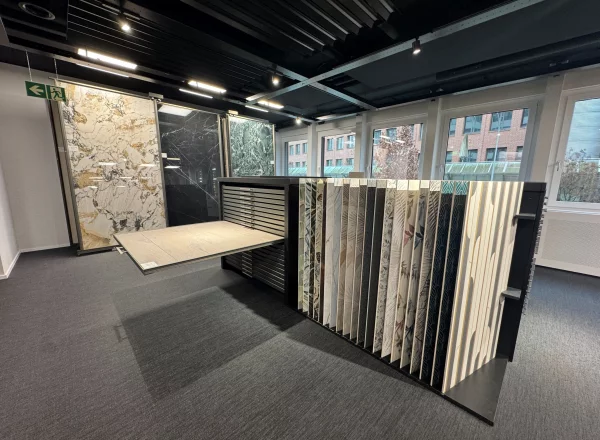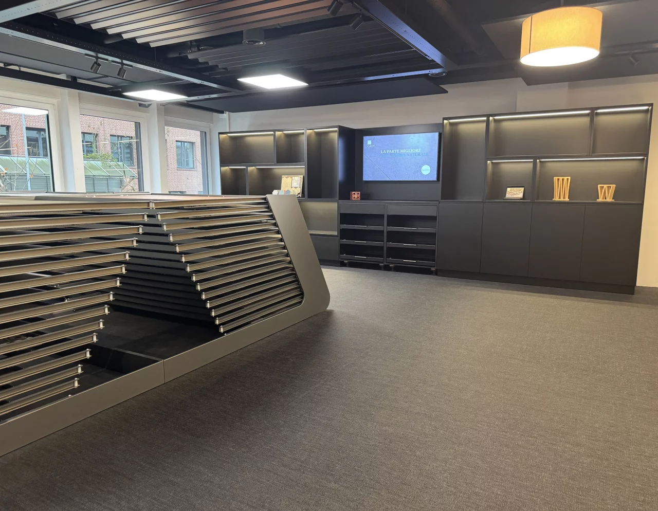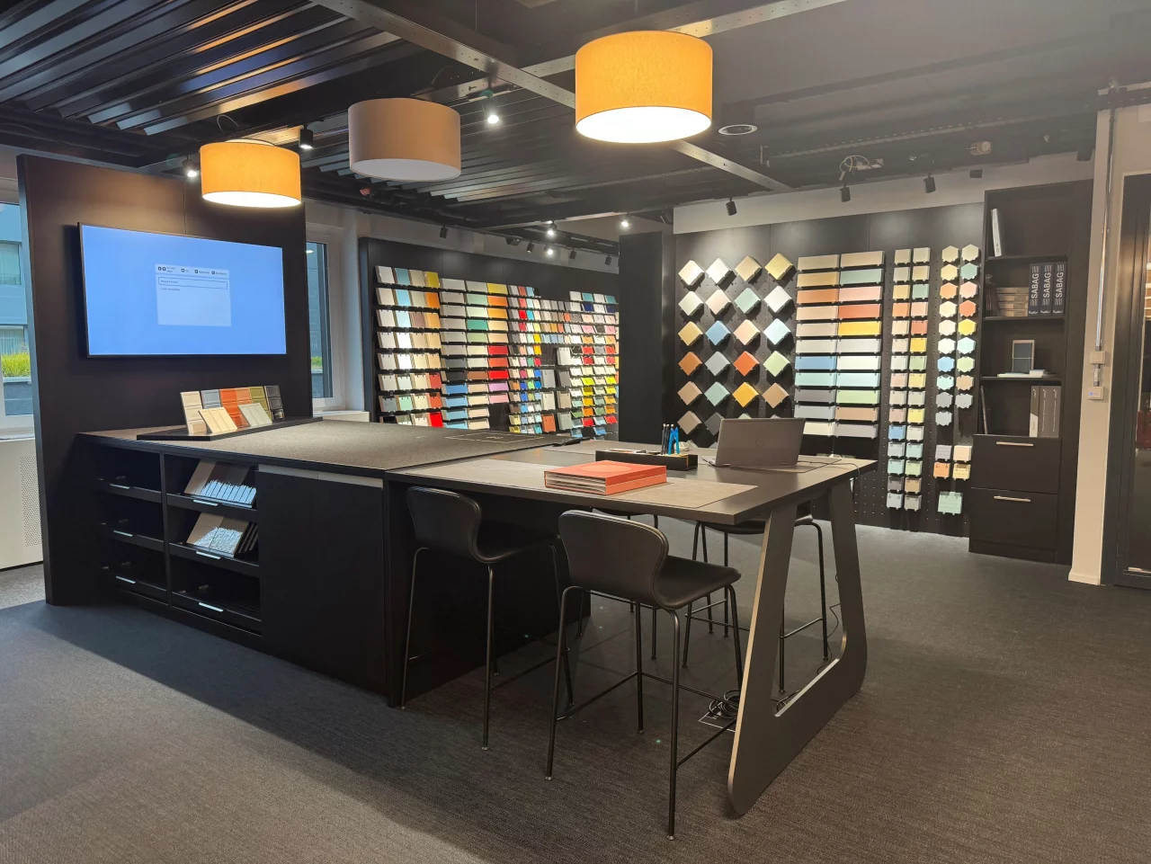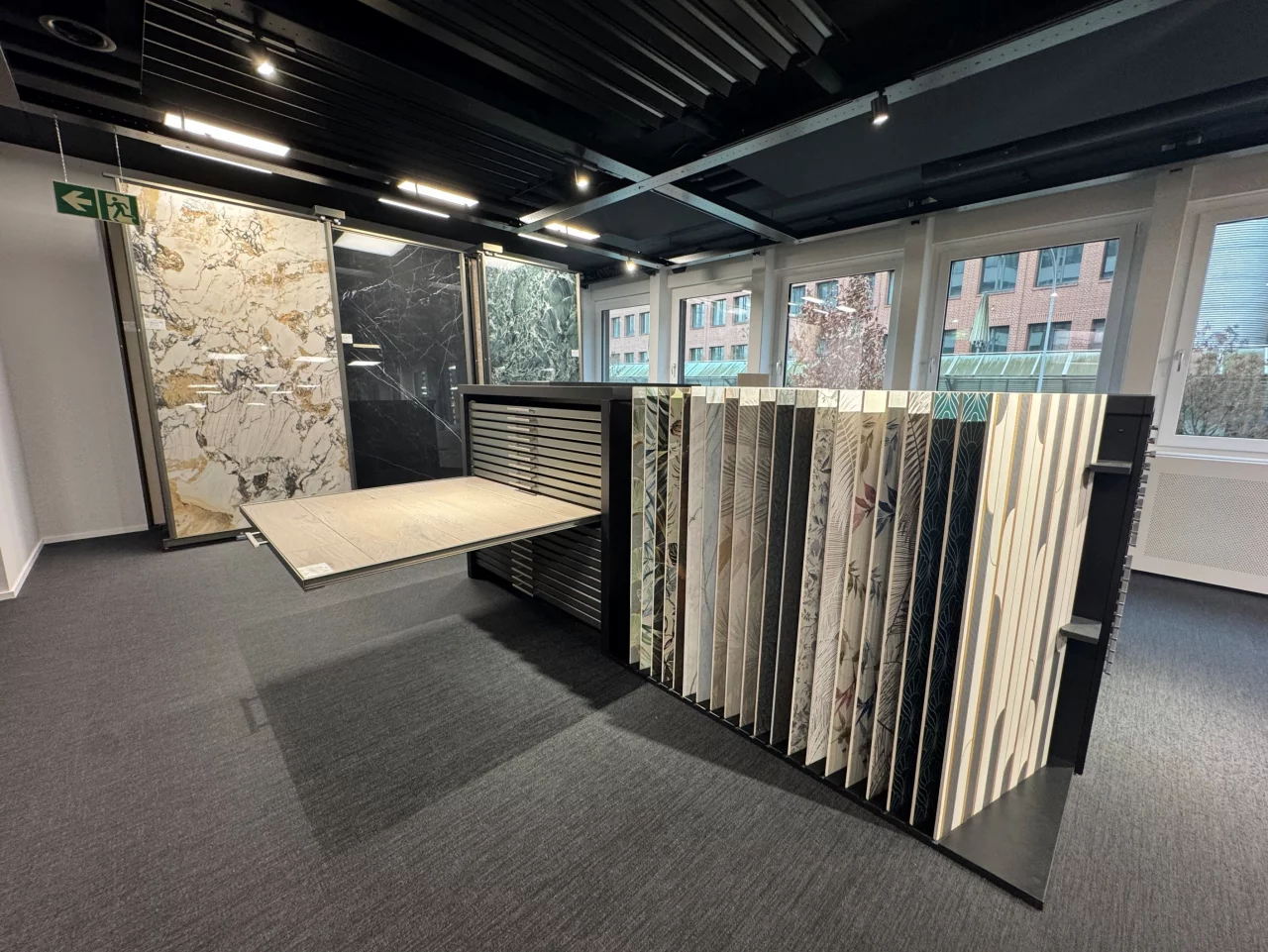 Ganzheitliche Gestaltung, bei der Architektur, Materialien und Präsentationsmöbel ein stimmiges Gesamtbild erzeugen.