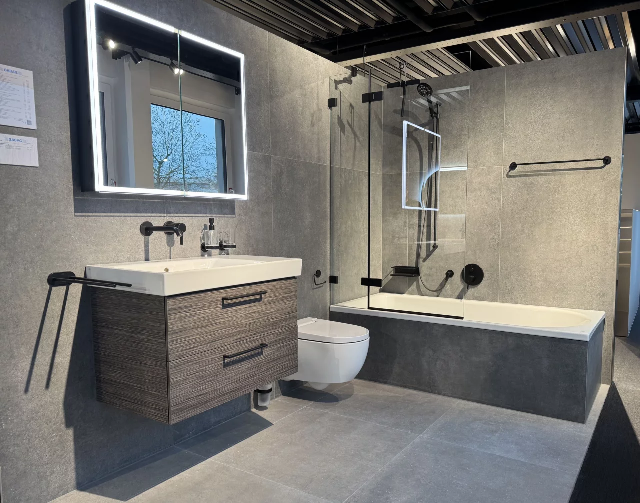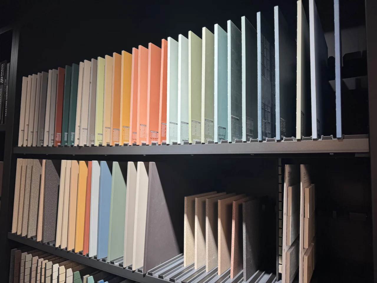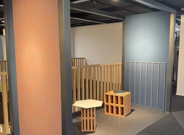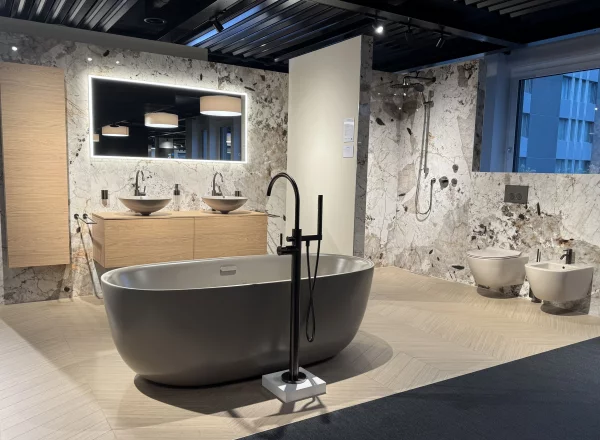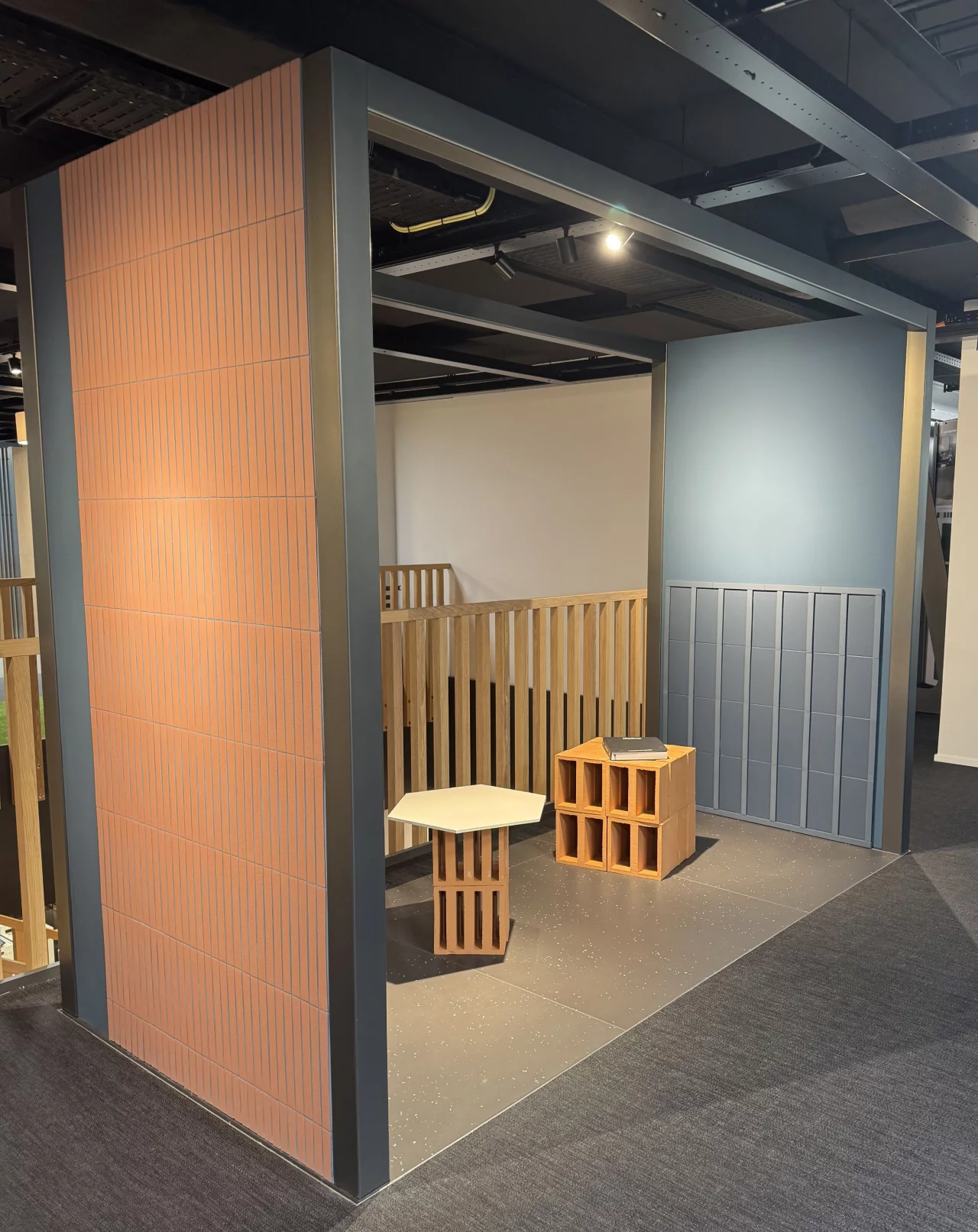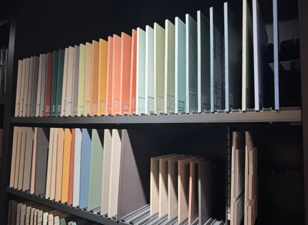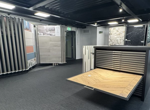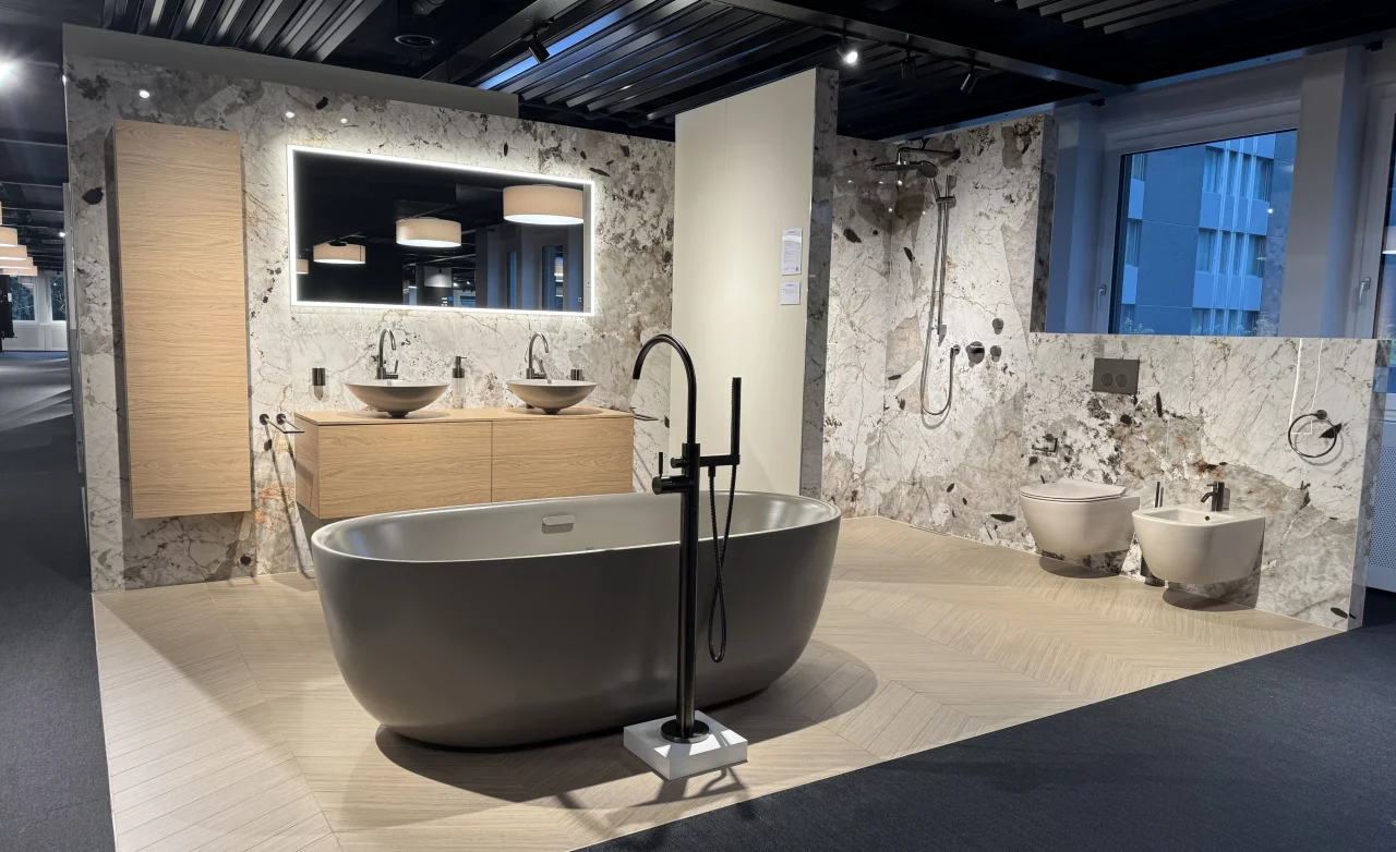 Ganzheitliche Gestaltung, bei der Architektur, Materialien und Präsentationsmöbel ein stimmiges Gesamtbild erzeugen.