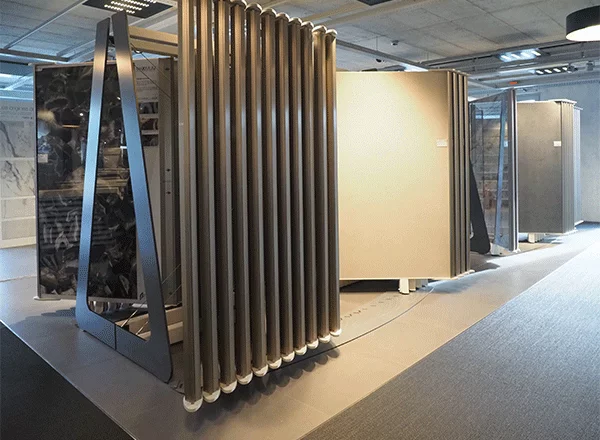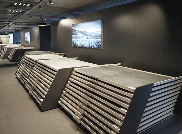 In den zeitlosen Cupa-Präsentationsmöbeln finden insgesamt mehr als 700 Produkte aus den Bereichen Wand- und Bodenbeläge sowie 240 Großformat-Platten bequem Platz. Die freitragenden Auszüge geben den schweren Fliesentafeln eine nahezu federleichte Optik. Und genauso leicht lassen sich die Möbel auch bedienen.
