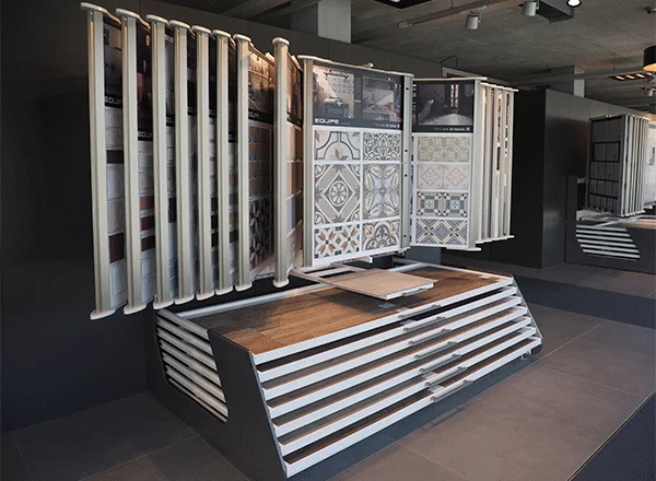 Wand- und Bodenbeläge in direktem Vergleich? Spielerisch möglich mit unserer Kombianlage. Die verschiebbare Ablagefläche für Bodenmuster erlaubt es, alle Flächen direkt miteinander zu vergleichen.