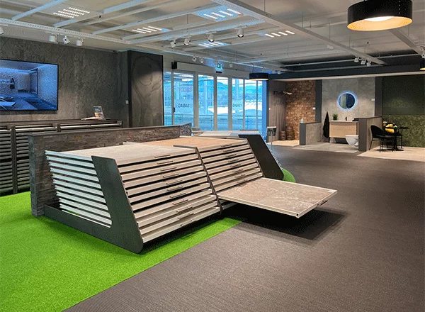Auch an diesem Standort steht im Eingangsbereich der markante Tresen mit Wiedererkennungswert im Mittelpunkt. Auf ca. 600 qm werden zahlreiche Wand- und Bodenbeläge sowohl für den Innen- als auch für den Außenbereich in der markanten Cupa-Serie präsentiert. In Verbindung mit Anwendungsbeispielen ein Konzept, das die Kunden überzeugt.