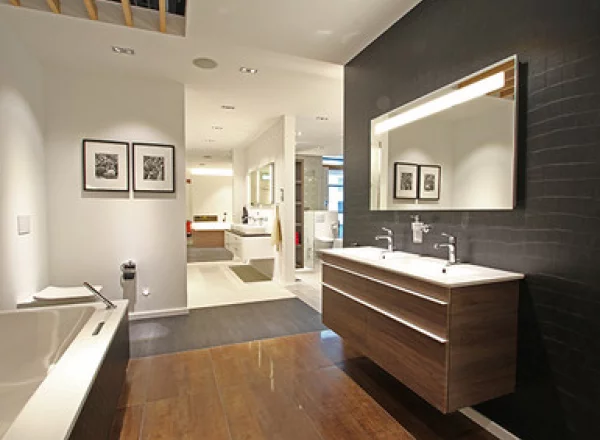 Punkten wir in den Ausstellungen der Baustofffachhändler mit unserem umfangreichen Sortiment an Präsentationsmöbeln für Baustoffe, mit unseren Dienstleistungen im Bereich der Ausbaugewerke sowie mit den hohen Qualitätsstandards, so beschränkt es sich bei unseren Sanitärkunden häufig auf den sogenannten Kojenbau durch die Erstellung von Wänden und Decken. Auch heißt es: „Sanitärkunden ticken anders“ aber dieses im positiven Sinne, Sanitär ist eben ein sehr feinfühliger Bereich. Die Produkte der Sanitärbranche sind heutzutage Zutaten privater und oft auch intimer Wohlfühloasen. Wellness und Erholung haben für die Kunden einen immer höheren Stellenwert und eben dieses Gefühl und dieser Stellenwert sollte durch die neuen Ausstellungen und deren Qualität unterstrichen und vermittelt werden.