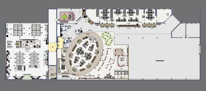 Herzstück der Ausstellung ist der zentrale Bereich für die Arbeits- und Beraterplätze, angelegt als Oval mit einer aufgeständerten Decke, die eine optimale Beleuchtung und eine gute Akustik garantiert. Ebenso wie im Profibereich können die Kunden zur Hauptzeit an Quickcountern im Stehen bedient werden oder aber auch für längere Beratungen an bequeme Sitzhocker gebeten werden. Dass Kunden und Mitarbeiter sich gleichermaßen wohlfühlen und zugleich die Arbeitsabläufe optimiert werden, war eine der Vorgaben an das Konzept der neuen Ausstellung. Außerdem sollte sie zukunftsorientiert, emotional und natürlich auch ertragsorientiert sein. Dieses wurde in einer intensiven Beratungs- und Planungsphase ebenso besprochen wie ein exakt festgelegter Zeitplan für den Umbau im laufenden Betrieb, ohne den täglichen Ablauf all zu sehr zu stören – alles lief anschließend Hand in Hand, gesteuert durch das Projektteam der Fa. HAUFF.
