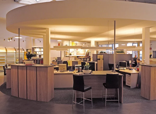 Herzstück der Ausstellung ist der zentrale Bereich für die Arbeits- und Beraterplätze, angelegt als Oval mit einer aufgeständerten Decke, die eine optimale Beleuchtung und eine gute Akustik garantiert. Ebenso wie im Profibereich können die Kunden zur Hauptzeit an Quickcountern im Stehen bedient werden oder aber auch für längere Beratungen an bequeme Sitzhocker gebeten werden. Dass Kunden und Mitarbeiter sich gleichermaßen wohlfühlen und zugleich die Arbeitsabläufe optimiert werden, war eine der Vorgaben an das Konzept der neuen Ausstellung. Außerdem sollte sie zukunftsorientiert, emotional und natürlich auch ertragsorientiert sein. Dieses wurde in einer intensiven Beratungs- und Planungsphase ebenso besprochen wie ein exakt festgelegter Zeitplan für den Umbau im laufenden Betrieb, ohne den täglichen Ablauf all zu sehr zu stören – alles lief anschließend Hand in Hand, gesteuert durch das Projektteam der Fa. HAUFF.