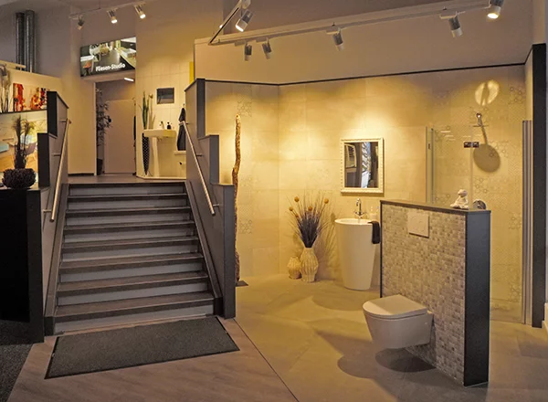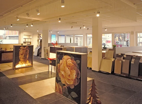 Empfangen werden die Ausstellungsbesucher von Anwendungen für Bad und Wohnen – und finden dort auch direkt ihren Ansprechpartner. Die Türenausstellung mit Garagentor in Funktion und eine Dachflächenfensterpräsentation ziehen den Kunden in die Tiefe des Raumes. Der im Materialmix abgesetzte Rundweg führt weiter zum Parkett- und Laminatbereich und von dort in die großzügige Fliesenausstellung. Hier sind Großformate das vorherrschende Thema. Unterstützt durch emotionale Anwendungsbeispiele findet der Kunde hier seine Stilrichtung.